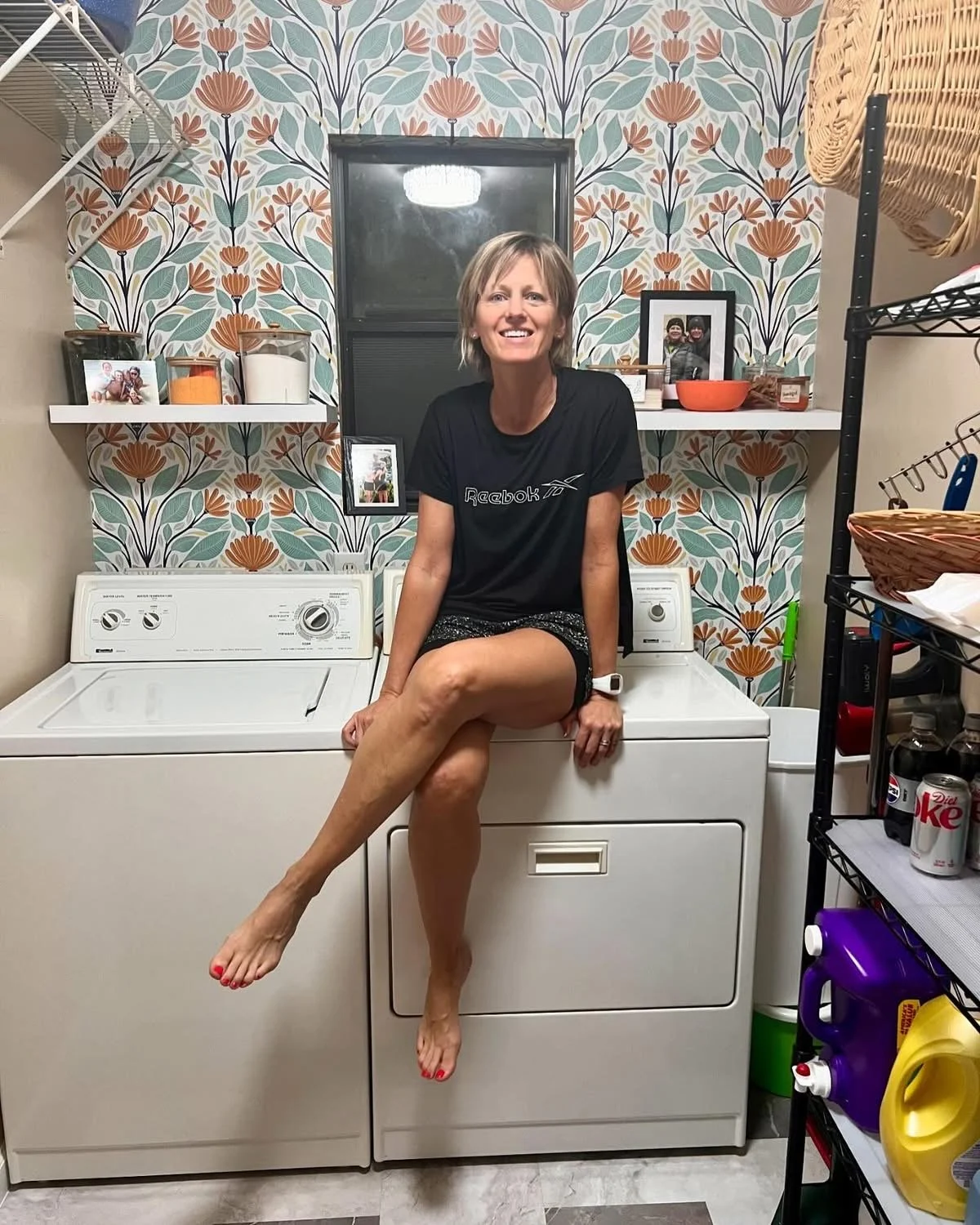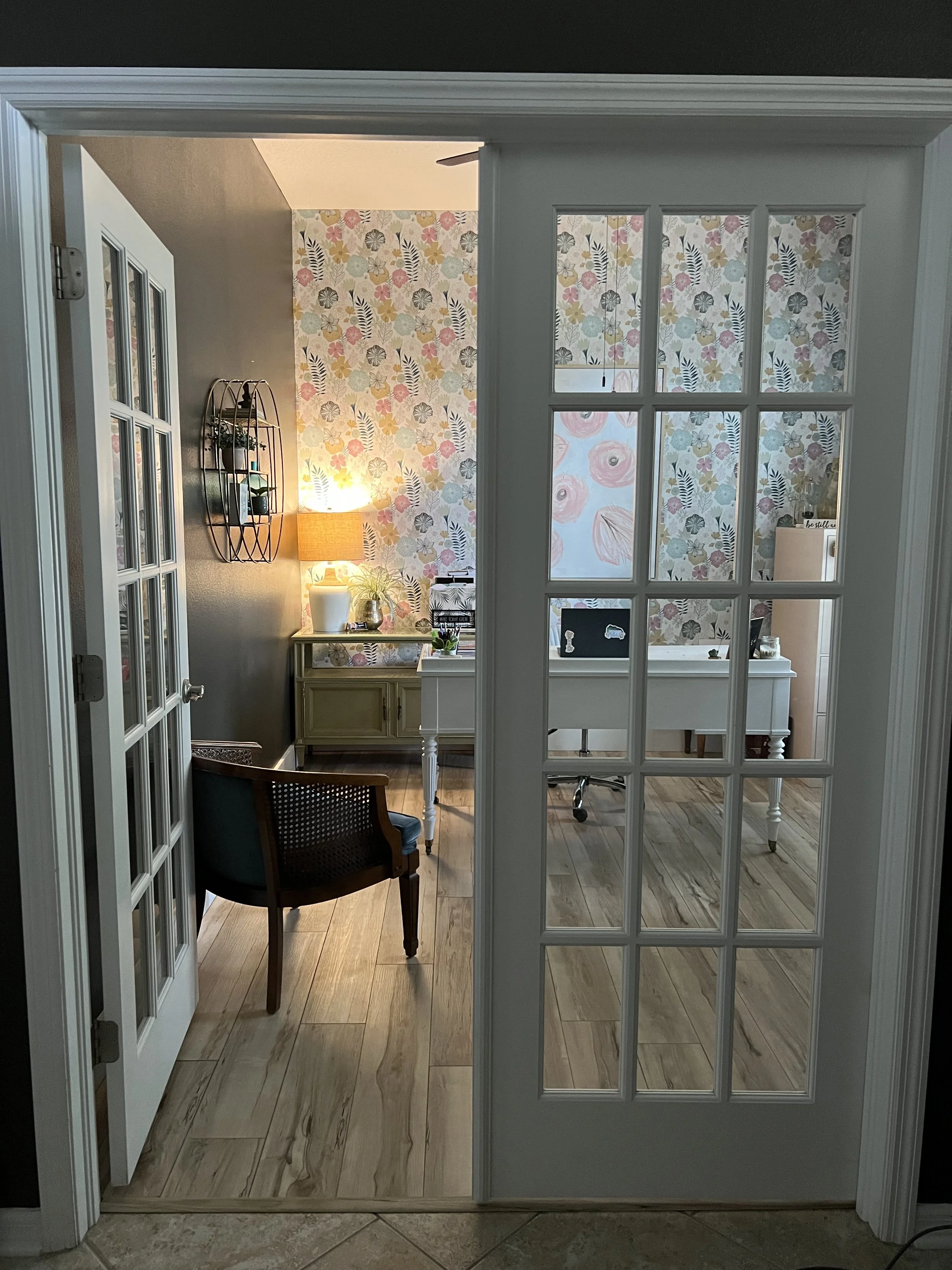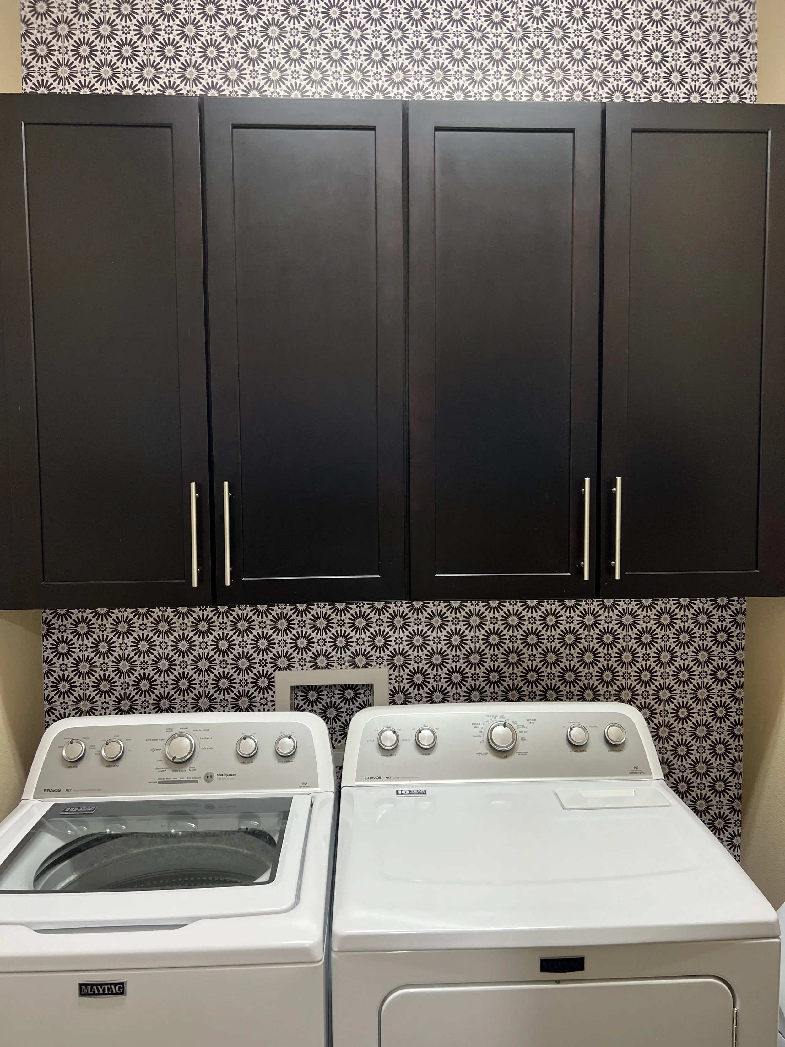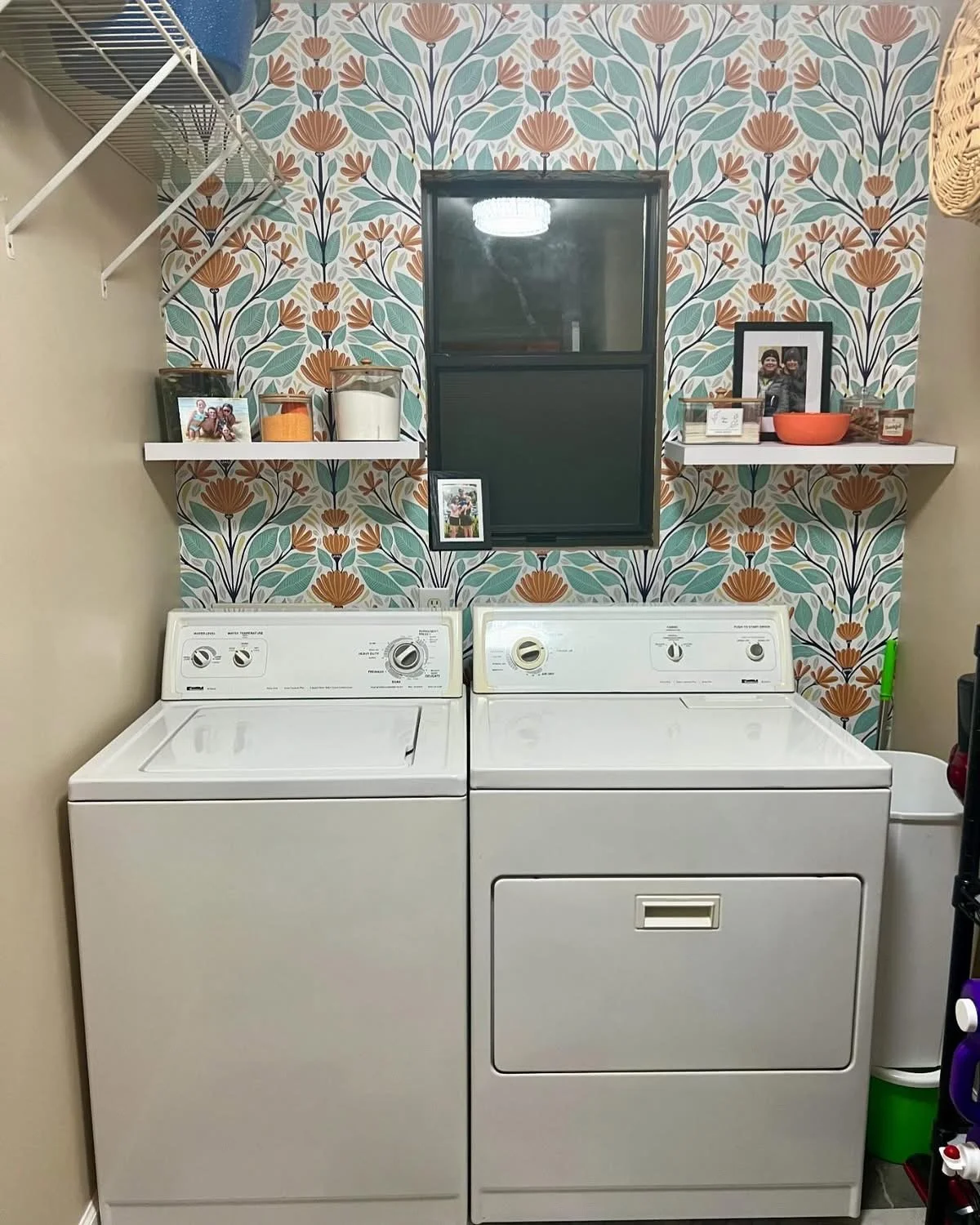 Added wallpaper, open shelves, removed blinds and placed privacy film.